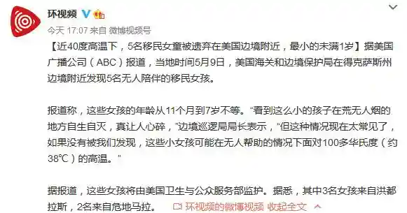 报道称,这些女孩的年龄从11个月到7岁不等。“看到这么小的孩子在荒无人烟的地方自生自灭,真让人心碎,”边境巡逻局局长表示,“但这种情况现在太常见了,如果没有被我们发现,这些小女孩可能在无人帮助的情况下面对100多华氏度(约38℃)的高温。”