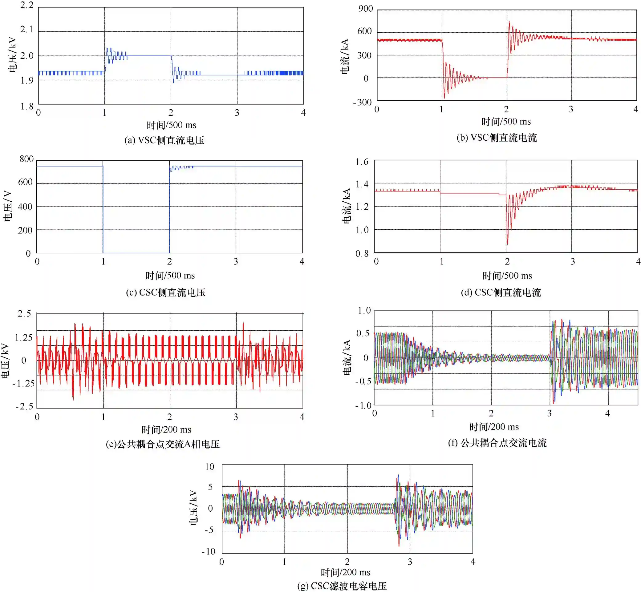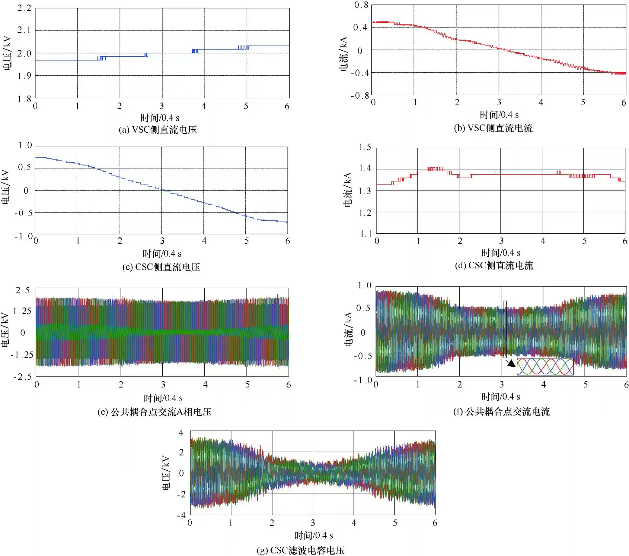 混合DC/DC换流器CSC侧滤波电容电压波形如图9(g)所示。功率变化过程,电压幅值平滑切换。