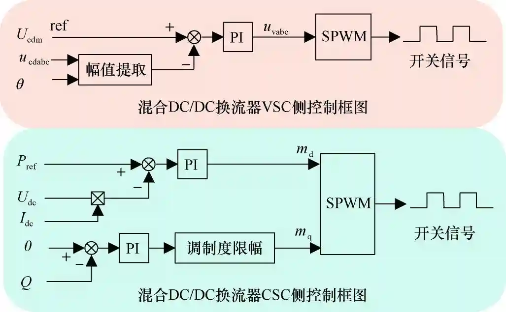 通过采集混合DC/DC换流器CSC侧直流电压与电流得到换流器有功功率并与参考值比较后经PI调节器输出得到调制度的d轴分量。通过采集交流侧电压电流得到公共耦合点处的无功功率,与参考值比较后经PI调节器输出得到调制度的q轴分量。经过SPWM调制,得到混合DC/DCCSC侧桥臂器件的开关信号。