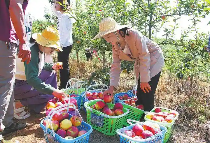 时下,正是各种果子大量上市的时节。在漫庭农场里,工人们正忙着采摘、搬运、包装,还有很多顾客前往农场体验采摘果子的乐趣。周超手把手地向顾客传授采摘经验并介绍不同品种的苹果,她说:“我手里的这个是华硕苹果,它最适合在高海拔地区种植,全身都红彤彤的,九分甜一分酸。”